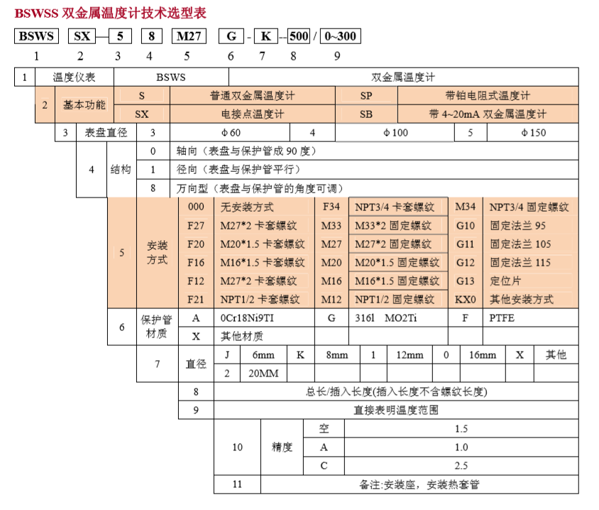 公司設計生產(chǎn)BSWSS工業(yè)雙金屬溫度計,產(chǎn)品規(guī)格品種齊全,包含普通的雙金屬溫度計,電接點式,萬向型,帶遠傳的雙金屬溫度計和帶4~20mA輸出的雙金屬溫度計。安裝方式種類齊全,套管規(guī)格多,完全能夠滿足客戶的定向需求。同時為了適應市場需求,設計雙金屬溫度計與套管分離,以保證在不停機的前提下,更換雙金屬溫度計。