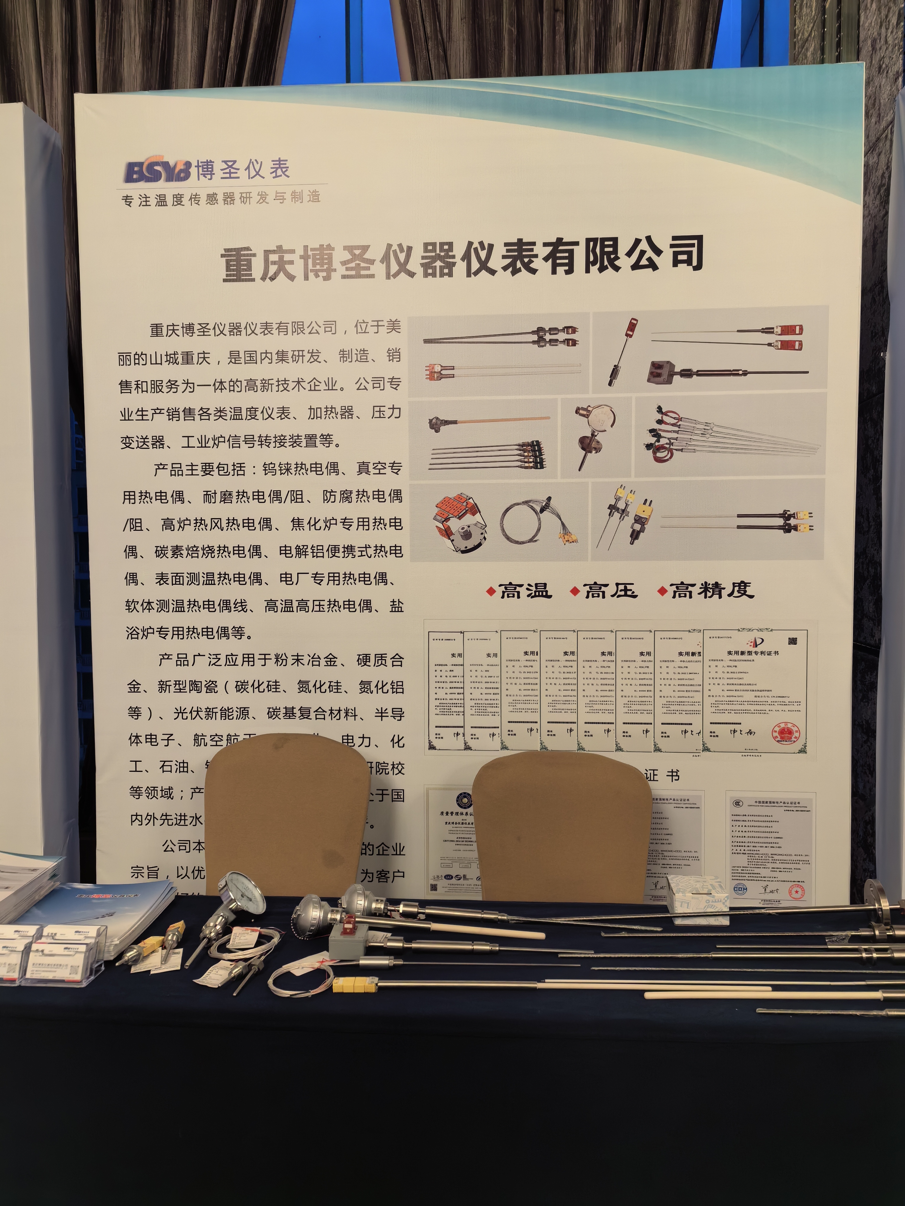 重慶博圣儀表在論壇現(xiàn)場設置專屬展臺,集中展示了鎢錸熱電偶、真空用熱電偶、高溫耐熱熱電偶等核心產品 —— 這些產品精準適配新型陶瓷生產中燒結、窯爐等工序的高溫、高壓工況,展板同步呈現(xiàn)了其在新型陶瓷、硬質合金等領域的應用場景,清晰傳遞了 “高溫?高壓?高精度” 的技術優(yōu)勢。